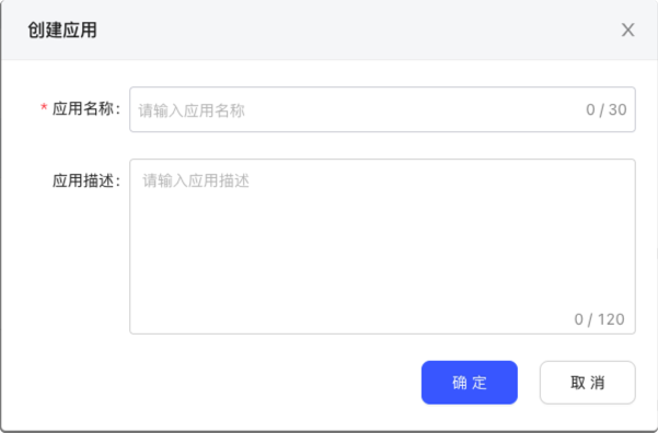 3、在创建应用弹窗中填写应用名称和应用描述,点击确定提交,完成创建。