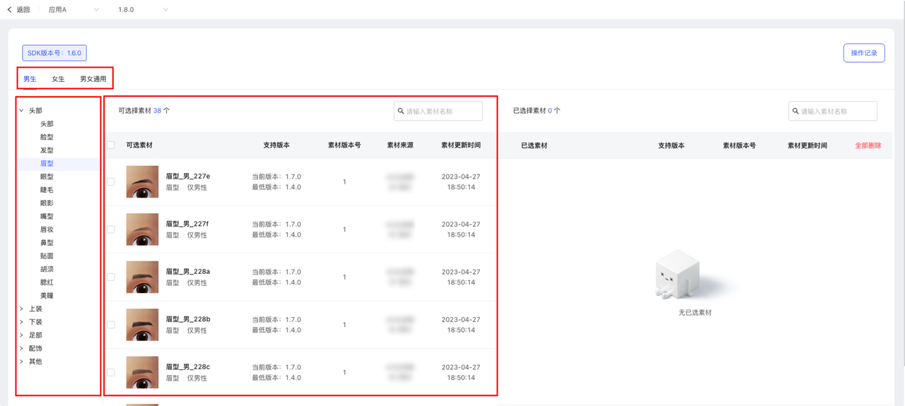 1、在已选素材列表中,点击素材右侧删除图标,即可将该素材从当前应用版本素材列表中删除。或在可选素材列表中反选对应素材,亦可将该素材从当前应用版本